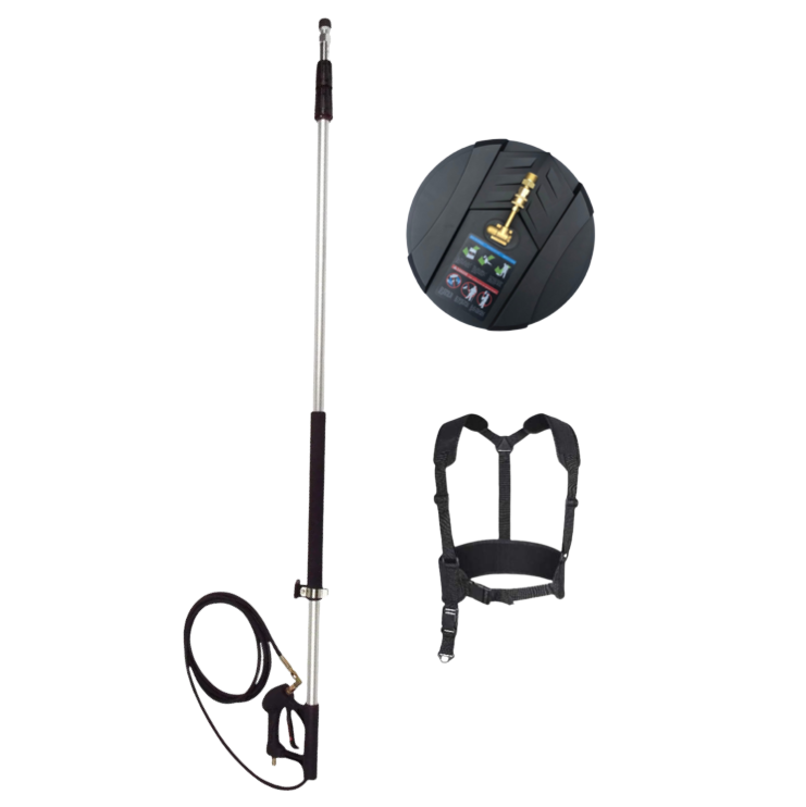 This high-pressure telescopic lance (from 2.1 to 7.4 m) is made of fiberglass and aluminum and is fully equipped with a high-pressure gun, a high-pressure nozzle and an articulated joint. It offers a total length of up to 7.40 meters, which allows you to easily carry out high-pressure cleaning tasks on walls, floors and even in hard-to-reach areas. The telescopic lance is made of fiberglass and aluminum, which makes it 30% lighter compared to other lances. It is compatible with a wide range of accessories, such as dirt blasters, wall and floor cleaners.