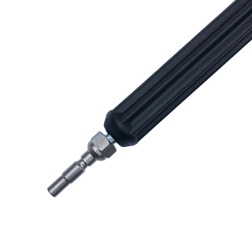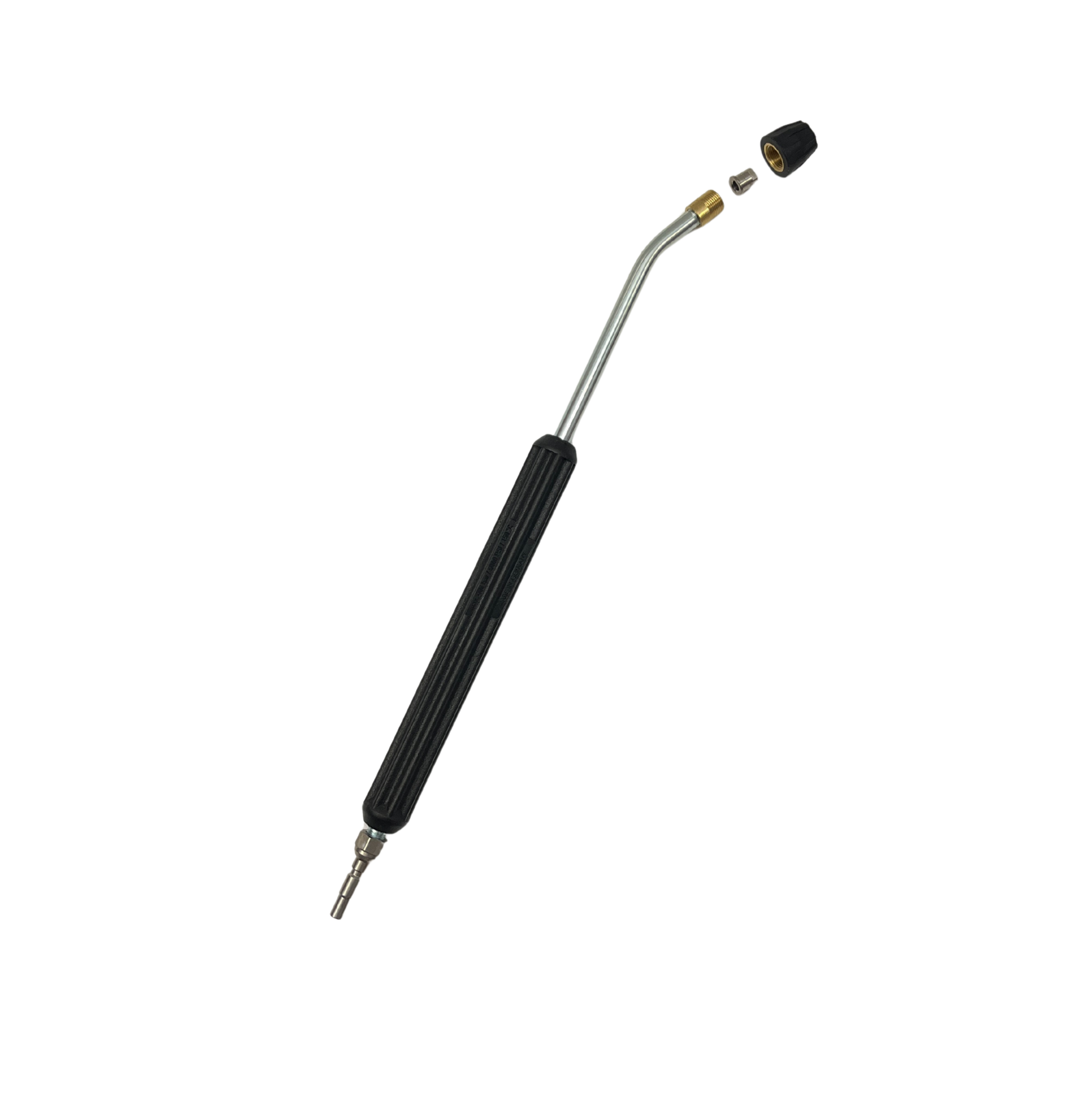 Profi-Lanze aus Stahl verzinkt mit Düsenträger und Hochdruckdüse. Die Lanze hat auf der einen Seite einen Düsenträger M18x1,5 Außengewinde mit der schwarzen Düsenschutzmutter + Hochdruckdüse und auf der anderen Seite den Anschluss an die Hochdruckpistole.