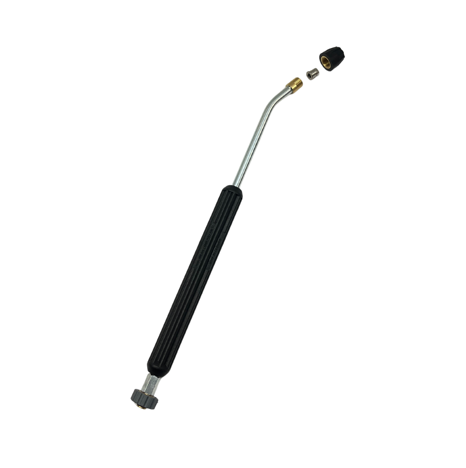 Profi-Lanze aus Stahl verzinkt mit Düsenträger und Hochdruckdüse. Die Lanze hat auf der einen Seite einen Düsenträger M18x1,5 Außengewinde mit der schwarzen Düsenschutzmutter + Hochdruckdüse und auf der anderen Seite den Anschluss an die Hochdruckpistole.