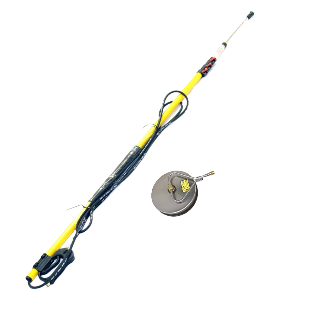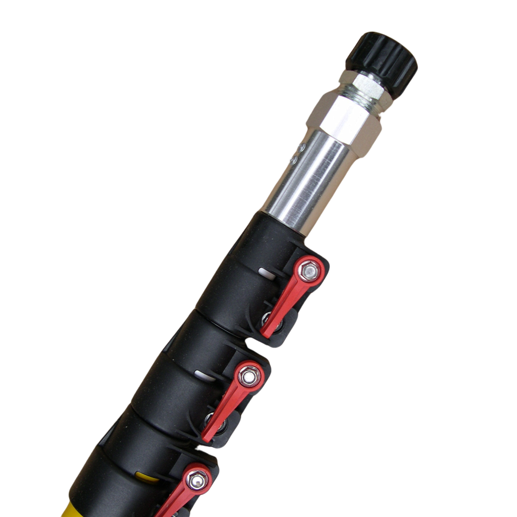 Hochdruck-Teleskoplanze aus Aluminium bzw. Aluminium und Fiberglas und Dachreiniger bzw. Wandreiniger, (je nach Ihrer Auswahl von ca. 1,6m bis 5,4m oder ca. 2,10m bis max. 7,4m ausziehbar). Der Lieferumfang ist komplett mit Hochdruckpistole, Edelstahl-Dachreiniger bzw. -Wandreiniger und 2 Düsen 1/4", passend für Kränzle und Kärcher HD und HDS Hochdruckreiniger mit Anschluss M22x1,5 Innengewinde am Hochdruckschlauch.