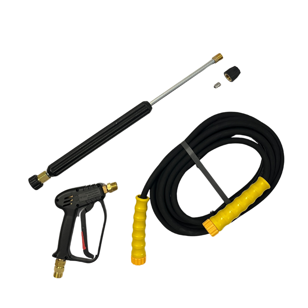 Es handelt sich um eine vierteilige komplette Profi-Spritzgarnitur mit einem 20m Hochdruckschlauch DN8 mit Stahlgewebeeinlage, einer Hochdruckpistole und einer Hochdrucklanze mit Düse, passend für alle Kränzle, sowie Kärcher HD HDS  Hochdruckreiniger (bis Baujahr 10/2016) mit M22 x 1,5 Anschluss.