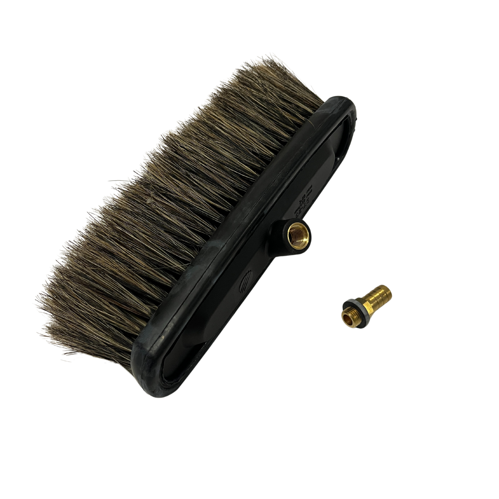 Die Waschbürste ist für den Handbetrieb und den Anschluss an die Wasserleitung geeignet. Das Wasser wird direkt durch die Lanze bzw. die Alurohr-Verlängerung zugeführt und tritt an der Bürste wieder aus.