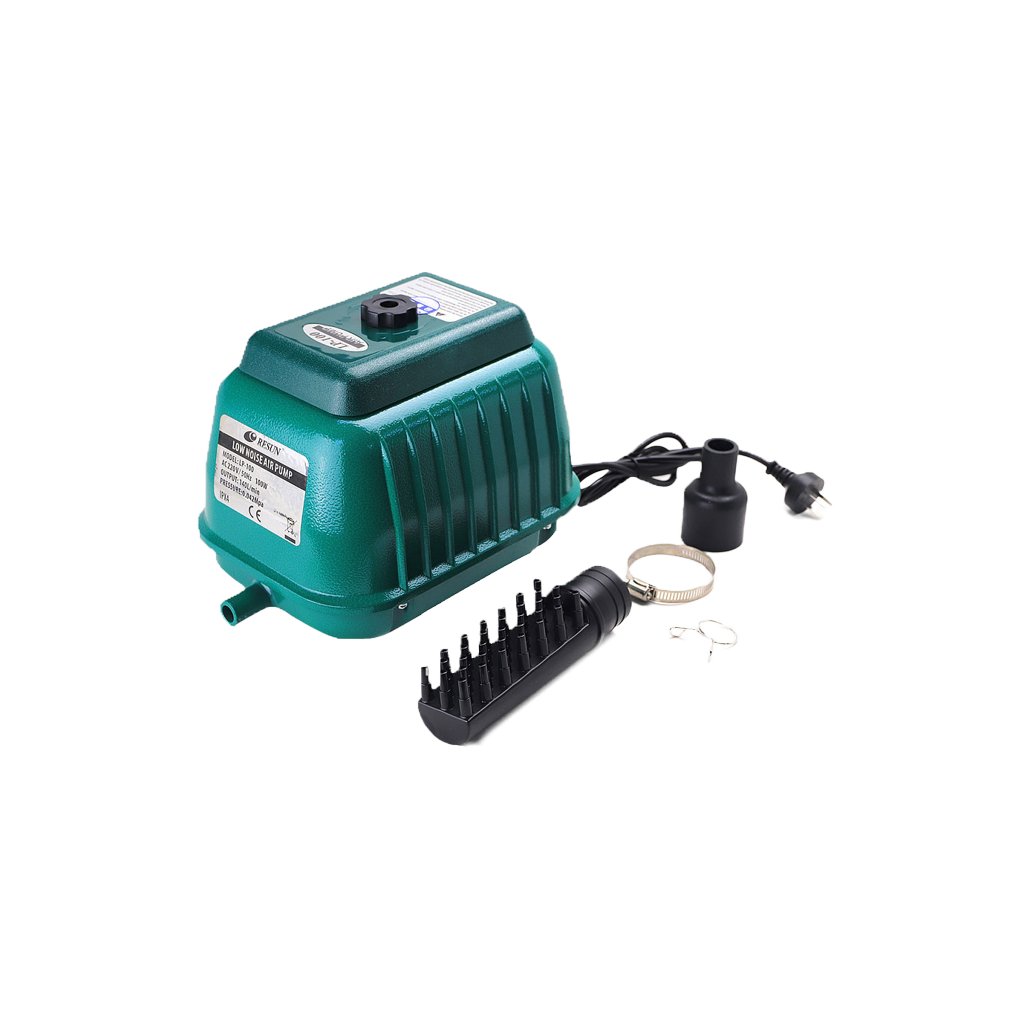 Dies ist eine Hochleistungs-Membranpumpe bzw. Sauerstoffpumpe mit einer Luftleistung von 9000 Liter/Stunde. Sie hat einen Luftausgang von ca. 20mm mit Gummiadapter von AG 20mm auf 45mm, sowie Schlauchschellen und 33-Fachluftverteiler.