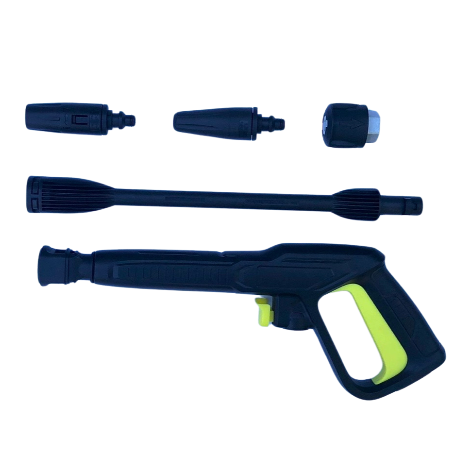 Es handelt sich um eine fünfteilige Spritzgarnitur bestehend aus Hochdruckreiniger-Abzugspistole, Lanze, variabler Düse, Quick Connect Adaptersowie Dreckfräse und ist mit einem Pistolen-Verriegelungsmechanismus für versehentliches Starten versehen. Das Set ist ein hochwertiges und langlebiges Qualitätsprodukt.
